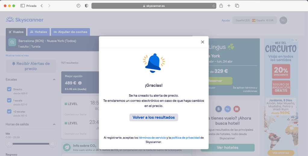 De esta manera, si en algún momento los precios para estos vuelos a Nueva York bajan o si suben, el sistema os avisará para que podáis decidir si comprar o esperar algo más de tiempo. Eso sí, ¡estad atentos a vuestro correo electrónico!