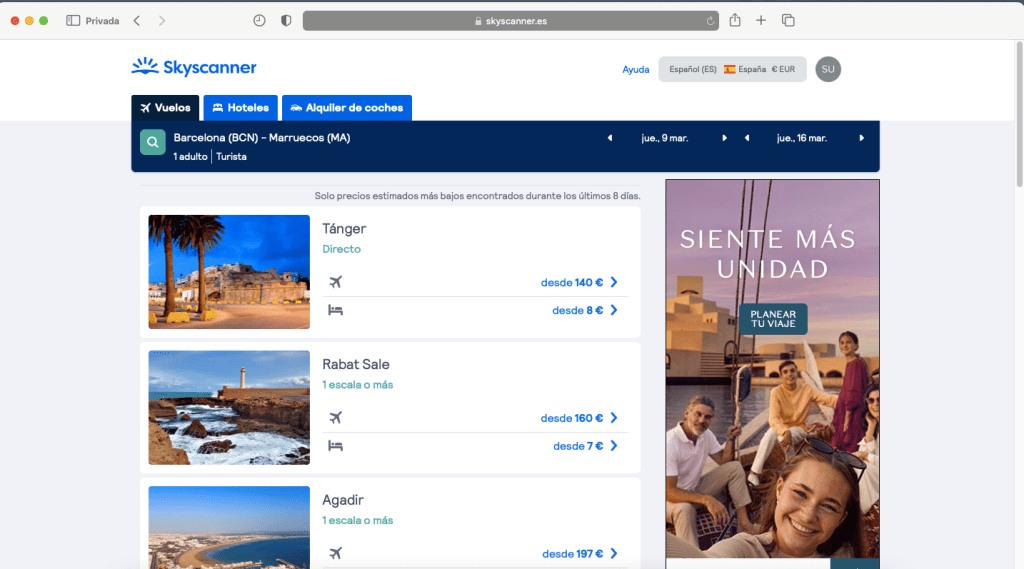 En el siguiente caso, he buscado viaje a Marruecos, indicando el país, y no una ciudad concreta. El buscador Skyscanner nos muestra los precios para volar a las diferentes ciudades del país: