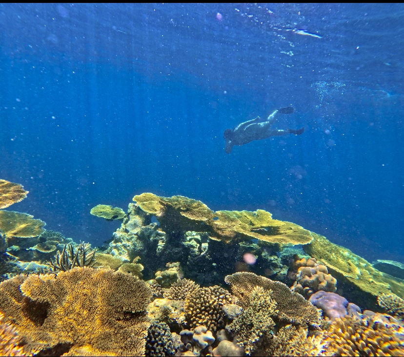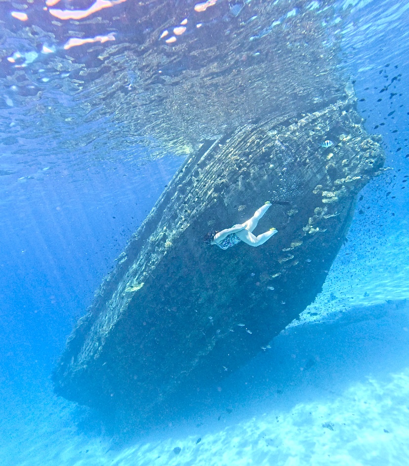 Después de la experiencia con los tiburones condujeron nuestra lancha hasta un barco hundido donde también pudimos hacernos fotos y vídeos sumergidos dentro del agua. Alrededor del barco se ha creado una gran diversidad de corales y animales que merece la pena de ver. A parte, muy cerca hay una barrera de coral con más especies y más vida marina.