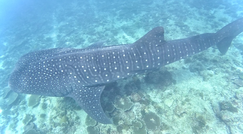 EL día siguiente al buceo, fuimos en busca del pez más grande del mar, el Tiburón ballena. Suena mucho más grande de lo que es, la verdad. Es un pez precioso y existen de varios tamaños; el que nosotros vimos estaba cerca de los 7-8 metros. Cuando lo ves de cerca, de lo que te das cuenta es que es un pez, muy grande sí, pero un pez. Pero lo que realmente es importante en la interacción con cualquier animal es el respeto por su espacio y tan solo disfrutar de lo que estás viendo. Aunque me pareció un animal precioso, como decía antes, la experiencia para verla no fue de las más gratas del viaje; la realidad es que había diez barcos más a parte del nuestro y la gente literalmente se pelea por estar más cerca del tiburón. En mi caso, tuve la oportunidad de tenerlo cerca un par de veces y después me aparté para evitar el agobio que suponía intentar estar mucho tiempo cerca de él.