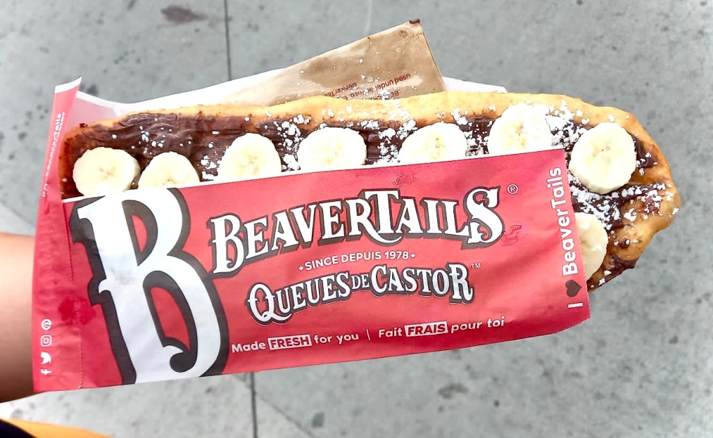 No podéis visitar Ottawa e iros sin probar las Beaver Tails o Colas de Castor, que es un dulce típico de la zona. La sensación que me dio al probarlo fue que la masa estaba hecha de lo mismo que los churros. Entonces podías escoger varios topings para poner encima de la masa. En nuestro caso, probamos el que llevaba crema de chocolate y plátano, pero podéis encontrar otros con cheesecake, con oreo, con brownie, etc. Podéis encontrar más información y todos los productos, aquí porque vale la pena probarlo antes de iros de Ottawa. Desconozco si se puede comer en otros lugares, pero os lo comentaré de ser así.
